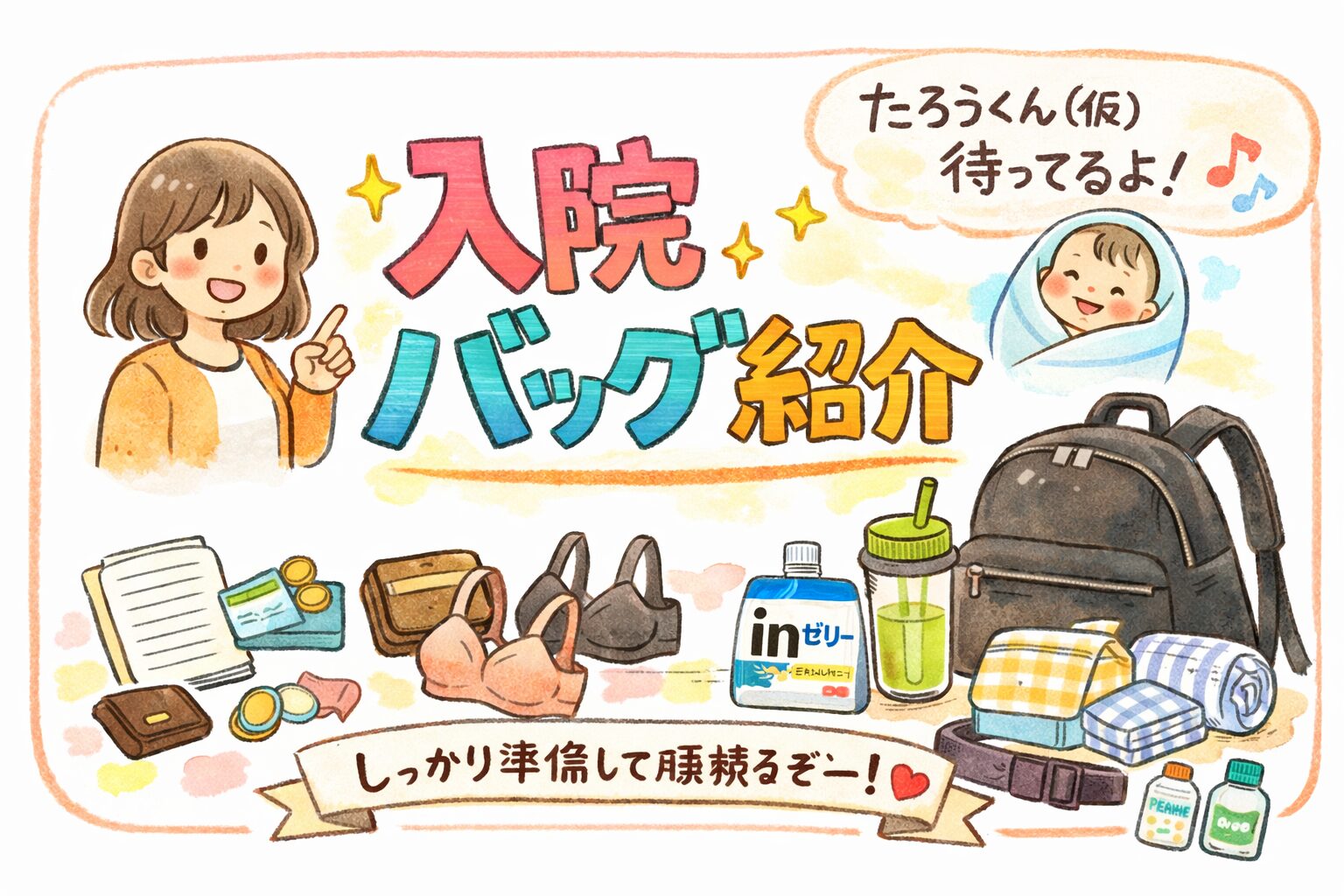 ・書類(母子手帳、マイナンバーカード、印鑑、筆記用具、入院申込書、産院のテキスト)